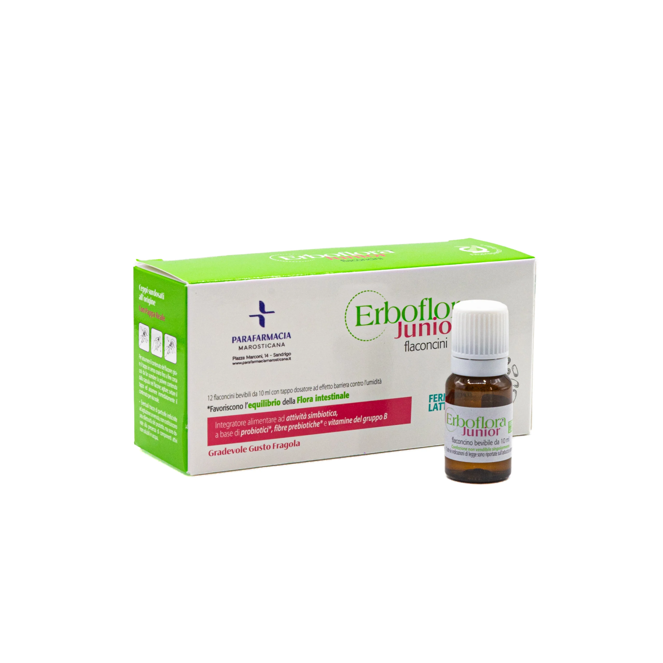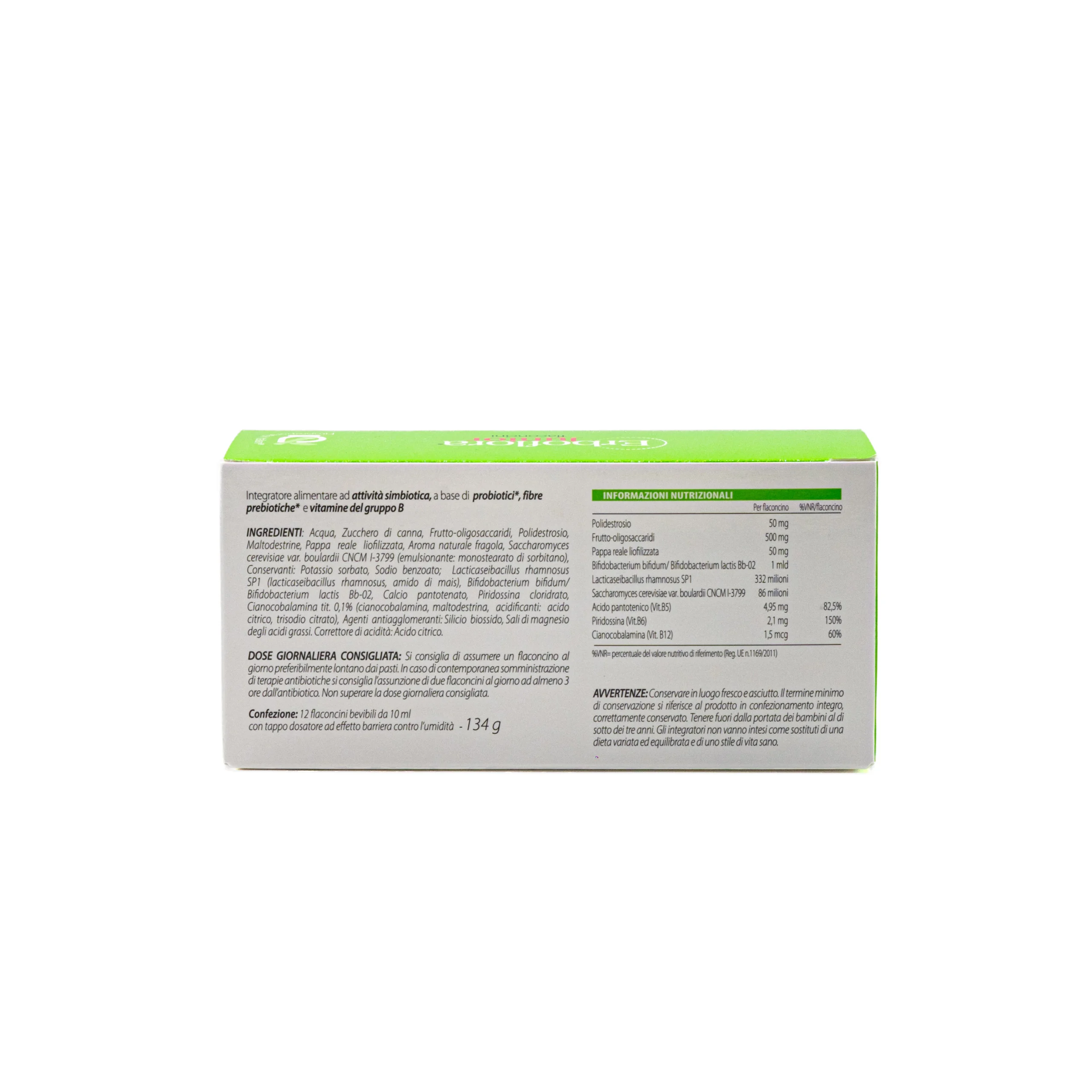 Acqua, Zucchero di canna, Frutto-oligosaccaridi, Polidestrosio, Maltodestrine, Pappa reale liofilizzata, Aroma naturale fragola, Saccharomyces cerevisiae var. buolardii CNCM l-3799 (emulsionante: monostearato di sorbitano), Conservanti: Potassio sorbato, Sodio benzoato; Lactobacillus rhamnosus SP1 (lactobacillus rhamnosus, amido di mais), Bifidobacterium bifidum/Bifidobacterium lactis Bb-02, Calcio pantotenato, Piridossina cloridrato, Cianocobalamina tit. 0,1% (cianocobalamina, maltodestrina, acidificanti: acido citrico, trisodio citrato), Agenti antiagglomeranti: Silicio biossido, Sali di magnesio degli acidi grassi. Correttore di acidità: Acido citrico. Informazioni nutrizionali: Per flaconcino: Polidestrosio 50 mg, Frutto-oligosaccardi 500 mg, Pappa reale liofilizzata 50 mg, Bifidobacterium bifidum/Bifidobacterium lactis Bb-02 1 miliardo, Lactobacillus rhamnosus SP1 332 milioni, Saccharomyces cerevisiae var. buolardii CNCM l-3799 86 milioni, Acido pantotenico (Vitamina B5) 4,95 mg (%VNR 82,5%), Piridossina (Vitamina B6) 2,1 mg (%VNR 150%), Cianocobalamina (Vitamina B12) 1,5 mcg (%VNR 82,5%). %VNR = percentuale del valore nutritivo di riferimento (Reg. UE n.1169/2011).