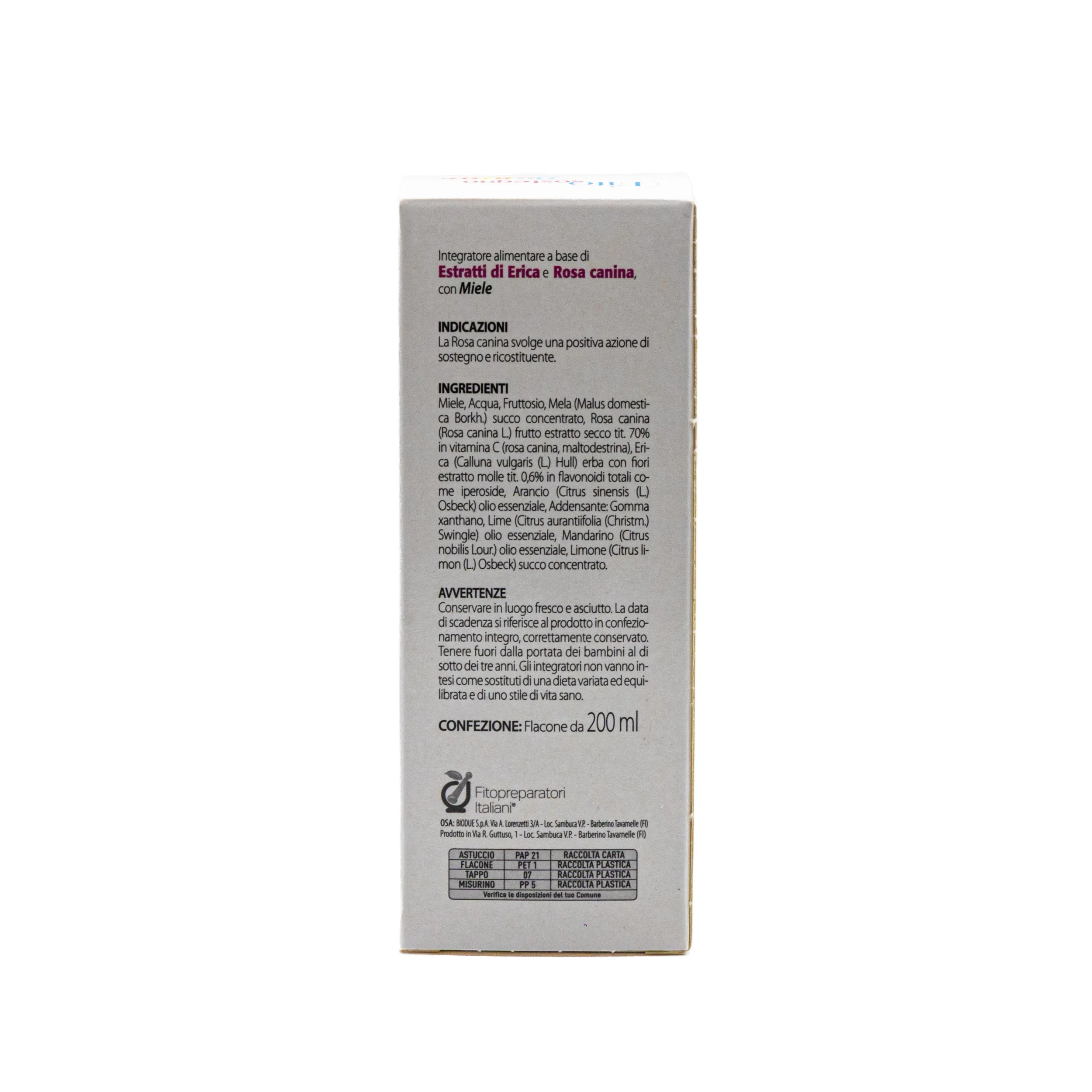 Miele, Acqua, Fruttosio, Mela (Malus domestica Borkh.) suco concentrato, Rosa canina (Rosa canina L.) frutto estratto secco tit 70% in vitamina C (rosa canina, maltodestrina), Erica (Canuls vulgaris (L.) Hull) erba con fiori estratto molle tit 0,6% in flavonoidi totali come iperoside, Aranzio (Citrus sinensis (L.) Osbeck) olio essenziale, Addensante: Gomma xanthano, Lime (Citrus aurantiifolia (Christm.) Swingle) olio essenziale, Mandarino (Citrus nobilis Lour.) olio essenziale, Limone (Citrus limon (L.) Osbeck) succo concentrato. Informazioni nutrizionali: Per 10 ml: Rosa canina estratto secco tit. 70% in Vitamina C 50 mg, pari a Vitamina C 35 mg (%VNR 43,7%), Erica estratto molle tit. 0,6% in flavonoidi totali come iperoside 50 mg, pari a flavonoidi totali come iperoside 0,3 mg, Miele 4,17 g, Arancio olio essenziale 10 mg, Lime olio essenziale 5 mg, Mandarino olio essenziale 5 mg. %VNR = percentuale del valore nutritivo di riferimento (Reg. UE n.1169/2011).