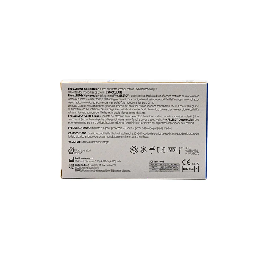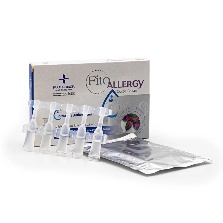 FitoAllergy gocce oculari è un dispositivo medico a uso oftalmico pensato per favorire il benessere degli occhi in caso di irritazione, arrossamento, secchezza e affaticamento causati da allergeni, polveri, agenti atmosferici o stress visivo. La soluzione sterile iso-osmolale, a pH fisiologico e priva di conservanti, combina estratto secco di Perilla, ricco di polifenoli antiossidanti, con acido ialuronico, noto per la sua elevata capacità di idratazione e lubrificazione oculare.